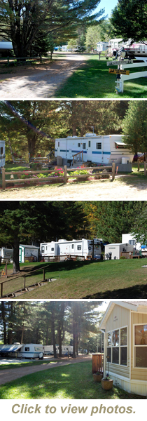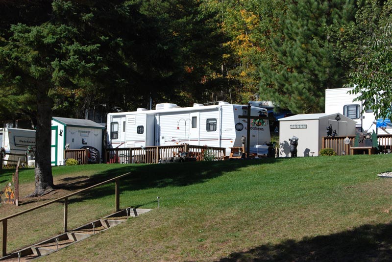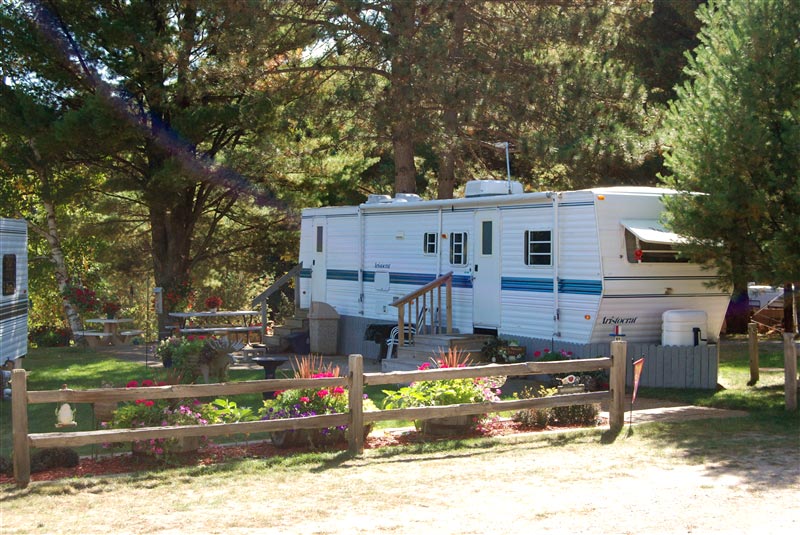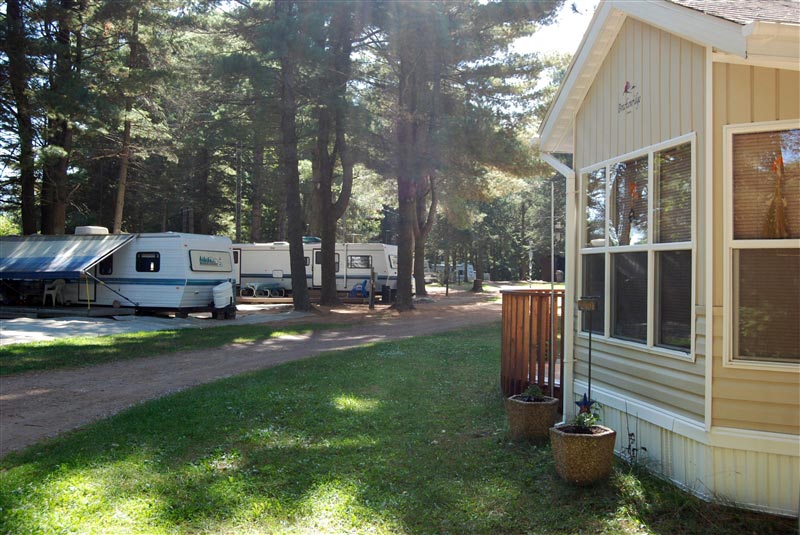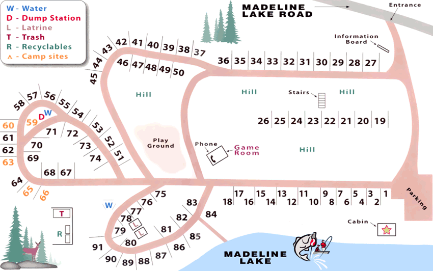 There are 90 seasonal RV sites located on five level grassed areas. Most have a view of the Madeline Lake. Most of the site have water, electric, sewer hook-up, and a patio. Picnic tables and fire rings are also included.